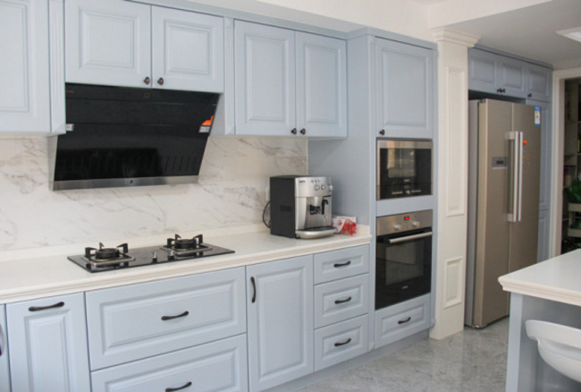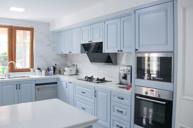 ▲淺籃色+白色搭配清新素雅,整個廚房風(fēng)格簡約大氣,實(shí)木板材讓廚房生活體驗(yàn)更加精致健康。